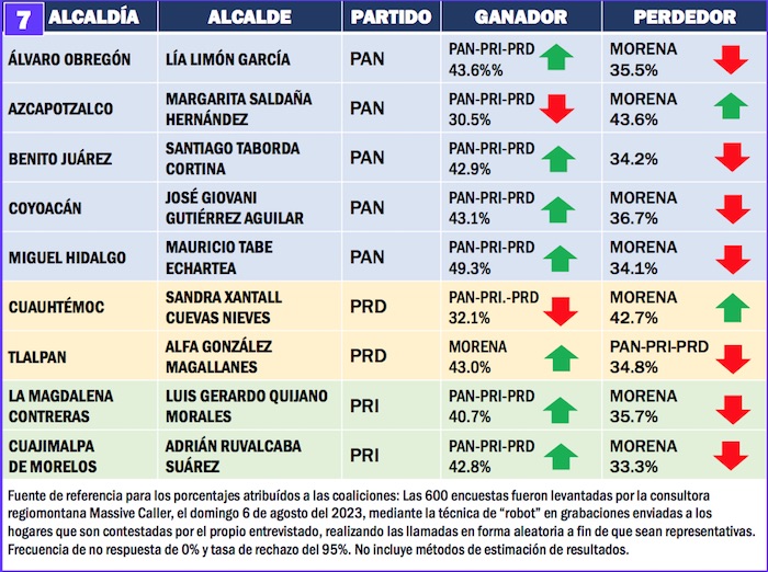 En particular, las proyecciones formuladas por la consultora regiomontana Massive Caller advierten que en una medición de principios de agosto, Morena estaría perfilado para ganar 9 de las 16 alcaldías de la Ciudad de México y, como parte de este proceso, la ratificación de sus triunfos en las siete demarcaciones que actualmente administra sería razonablemente cómoda.