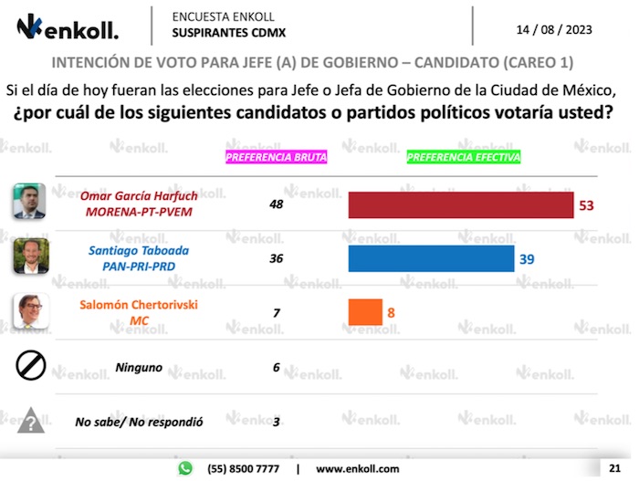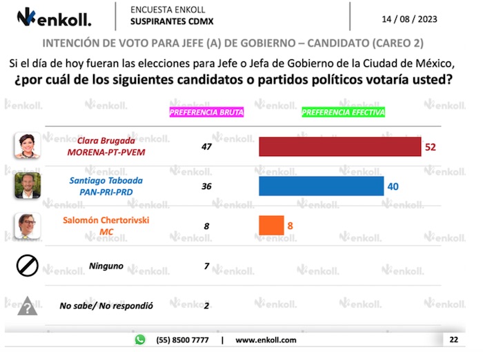En los careos de la encuesta Enkoll, ambos candidatos del oficialismo tienen una mayor intención de voto que el aspirante del bloque opositor, el panista Santiago Taboada y el emecista Salomón Chertorivski.