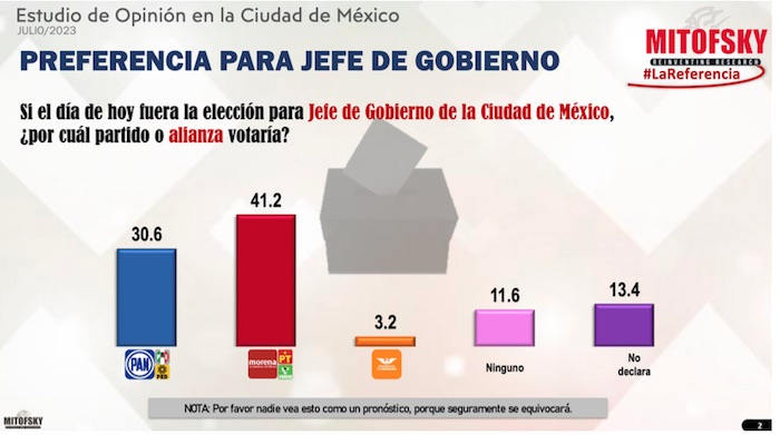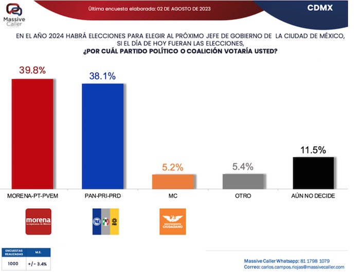 Una encuesta de Consulta Mitofsky da a Morena una ventaja del 41 por ciento del voto sobre el 30.0 por ciento del PRI-PAN-PRD, con Movimiento Ciudadano en un tercer lugar lejano con sólo el 3.2 por ciento de respaldos. Massive Caller a su vez muestra un resultado más cerrado, con Morena con un 39.8 por ciento y el PAN-PRI-PRD con el 38.1 por ciento. En este sondeo, MC se mantiene apenas con un 5.2 por ciento.