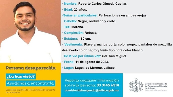 Ciudad de México, 17 de agosto (SinEmbargo).- Roberto Olmeda Cuéllar, Diego Lara Santoyo, Uriel Galván, Jaime Adolfo Martínez Miranda y Dante Cedillo Hernández son los cinco jóvenes provenientes del municipio de Lagos de Moreno, Jalisco, quienes desde la noche del pasado 11 de agosto permanecen en calidad de desaparecidos luego de que se reunieron para acudir a la feria de dicho municipio.