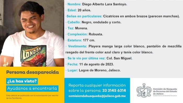 Diego Lara es un joven de 20 años de edad, quien trabajaba como herrero en el taller de su padre. Su familia lo describe como un joven alegre, quien presumía con orgullo su vehículo, el Volkswagen Jetta en color café, uno de los autos en los que se habrían transportado los cinco jóvenes y que en días recientes fue localizado por la Fiscalía de Jalisco.