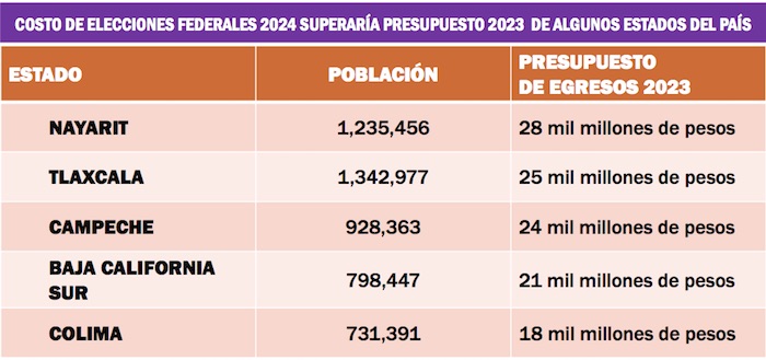 El costó de las elecciones federales para el próximo año superaría el que tuvieron este 2023 cinco estados del país. Es el caso de Nayarit (28 mil millones de pesos), Tlaxcala (25 mil millones de pesos), Campeche (24 mil millones de pesos), Baja California Sur (21 mil millones de pesos) y Colima (18 mil millones de pesos).