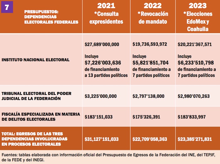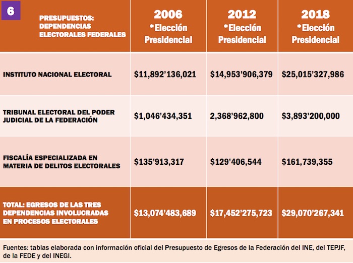 Para el 2024, el INE perfila pedir que le sean autorizados 37 mil millones de pesos para la contienda presidencial del 2024 —incluyendo operaciones del Instituto y financiamiento a los partidos políticos—, un aumento del 48 por ciento con respecto a los gastos de hace seis años. Una cifra fabulosa que rebasaría por mucho los presupuestos totales anuales de egresos que ejercerán este año algunos estados de la República.