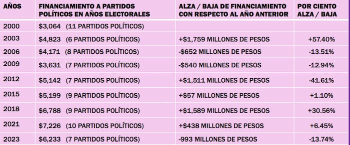 En el caso de los partidos políticos, el incremento en sus prerrogativas, de 2018 a 2024 sería del 59.13 por ciento.