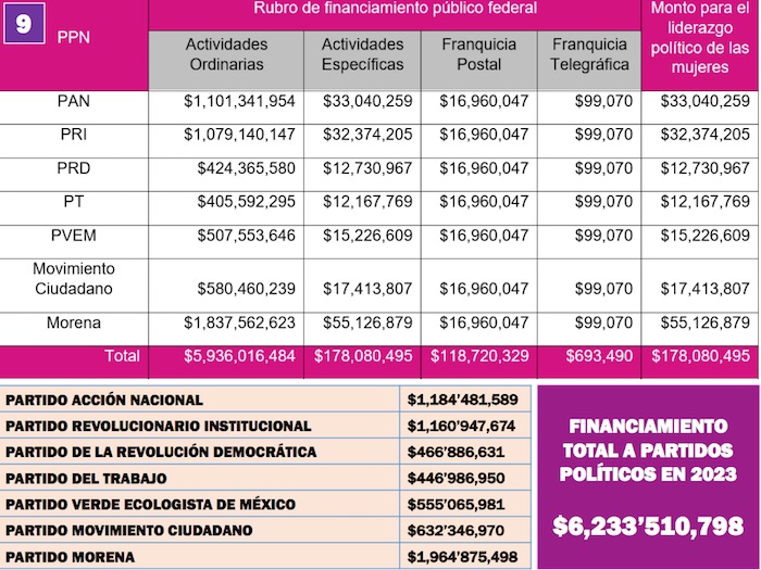 Si multiplicamos 65 por ciento de la UMA por el total del Padrón Electoral, como lo establece actualmente la Constitución Política de los Estados Unidos Mexicanos, el financiamiento de los Partidos políticos en 2024 equivaldría a 6 mil 613 millones 200 mil 823 pesos. Más un 50 por ciento para actividades tendientes a obtener el voto de los ciudadanos: 3 mil 306 millones 600 mil 411 pesos. Total para Partidos Políticos en 2024: 9,919 millones 801 mil 234 pesos.