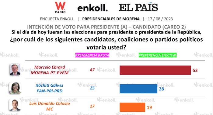 Si el candidato de Morena fuera Marcelo Ebrard y de Movimiento Ciudadano Colosio Riojas, las senadora Gálvez y Paredes registran un respaldo efectivo del 28 por ciento.