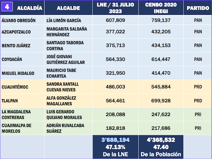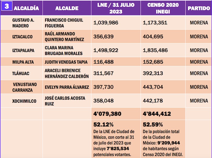 Por ejemplo, controla Gustavo A. Madero con un millón 39 mil 986 posibles votantes, e Iztapalapa con un millón 498 mil 922, más de la mitad de los que tienen el PRI, PAN y PRD, que gobiernan nueve alcaldías con 3 millones 688 mil 194 posibles votantes, siendo Álvaro Obregón la que tiene una mayor Lista Nominal con 607 mil 809 mexicanos con credencial vigente para votar.