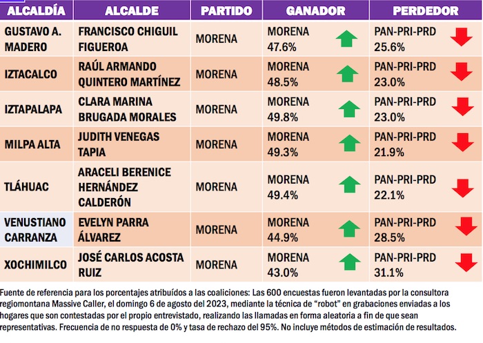 En particular, las proyecciones formuladas por la consultora regiomontana Massive Caller advierten que en una medición de principios de agosto, Morena estaría perfilado para ganar 9 de las 16 alcaldías de la Ciudad de México y, como parte de este proceso, la ratificación de sus triunfos en las siete demarcaciones que actualmente administra sería razonablemente cómoda.