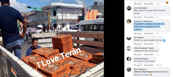 "Dos rebanadas de pizza también para los de Cintalapa que llegan en tres camiones al cruce de la 5A Norte y la Calle Central; tres camionetas cargadas de pizzas de ocho rebanadas más refrescos los esperan ahí [...]. Otras dos rebanadas para los de la lideresa de Coita que llega con 600 acarreados", señaló en una crónica.