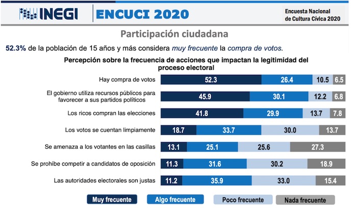 Más del 50 por ciento de los habitantes de México, de 15 años de edad y mayores, consideran muy frecuente la compra de votos en las elecciones. Y en todo el país, un 41.5 por ciento de los ciudadanos han sido testigos de alguna práctica corrupta o delito electoral, atribuido a partidos políticos, candidatos y funcionarios públicos.
