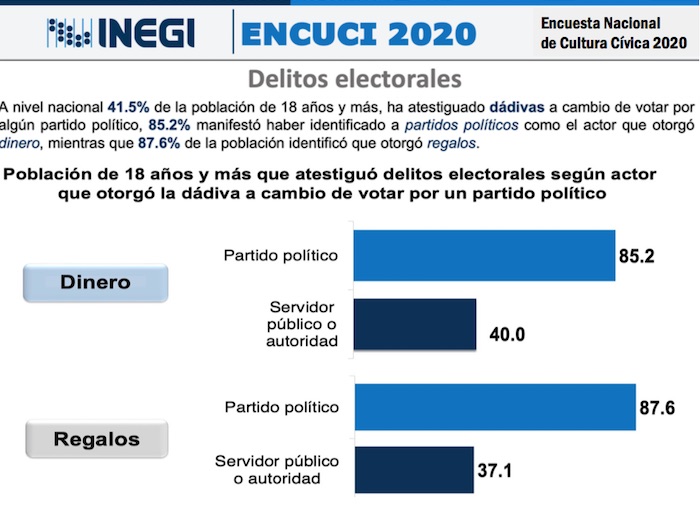 En todo el país, un 41.5 por ciento de los ciudadanos han sido testigos de alguna práctica corrupta o delito electoral, atribuido a partidos políticos, candidatos y funcionarios públicos, de acuerdo con cifras del INEGI comentadas en Puntos y Comas.