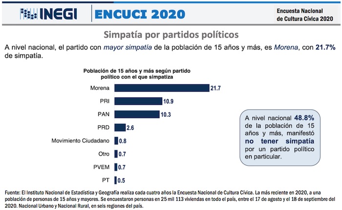 Al mismo tiempo, a nivel nacional el 48.8 por ciento de los mexicanos consultados manifestó no tener una simpatía en particular por algún partido político.