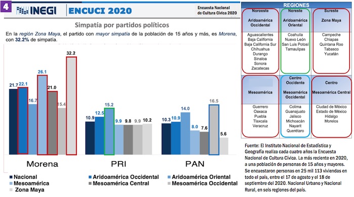 Los mismos números muestran que en la región de la Zona maya, Morena es el partido con mayor simpatía con el 32.2 por ciento. Sólo en Mesoamérica Occidental, el PAN tiene mayor respaldo de la población con el 16.5 por ciento contra 15.4 del partido guinda.