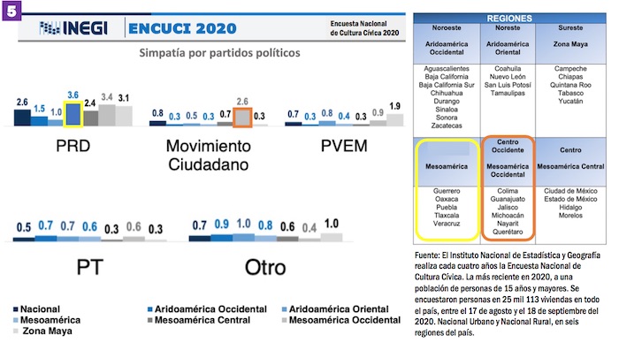 Por partido, el PRI tiene la mayoría de sus simpatías en Aridoamérica Oriental (15.2 por ciento), el PRD en Mesoamérica y Movimiento Ciudadano en Mesoamérica Occidental. Pese a ello, Morena domina en cinco de las seis regiones.