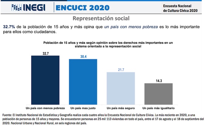 La aspiración más fuerte en un 32.7 por ciento de las personas entrevistadas es que debemos avanzar hacia un país con menos pobreza; otro 30.4 por ciento pide un país más justo; el 21.7 por ciento sueña con un país más seguro; y el 14.3 por ciento se pronuncia por un país más igualitario.