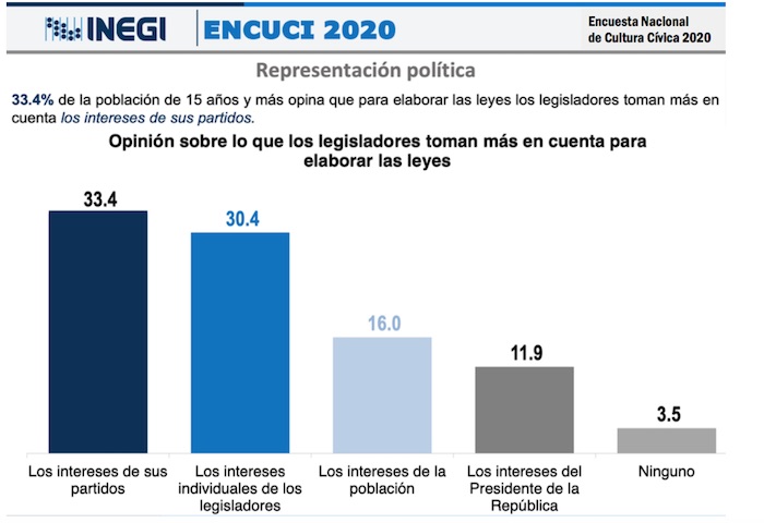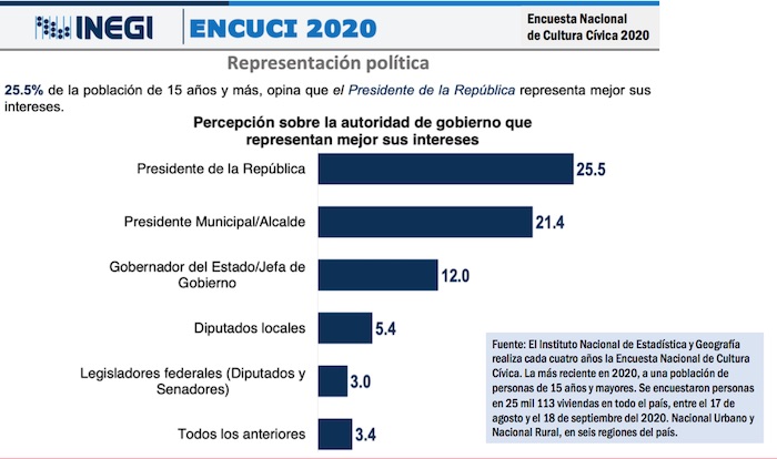 La Encuesta Nacional de Cultura Cívica 2020, elaborada por el Instituto Nacional de Estadística y Geografía (INEGI), que vimos en detalle esta semana, refleja la opinión de 25 mil personas de todo el país, que también concluyen que el Presidente de la República es la autoridad de gobierno que mejor representa sus intereses. Y nuevamente, en la última escala de confianza, ubican a diputados federales y senadores de la República.