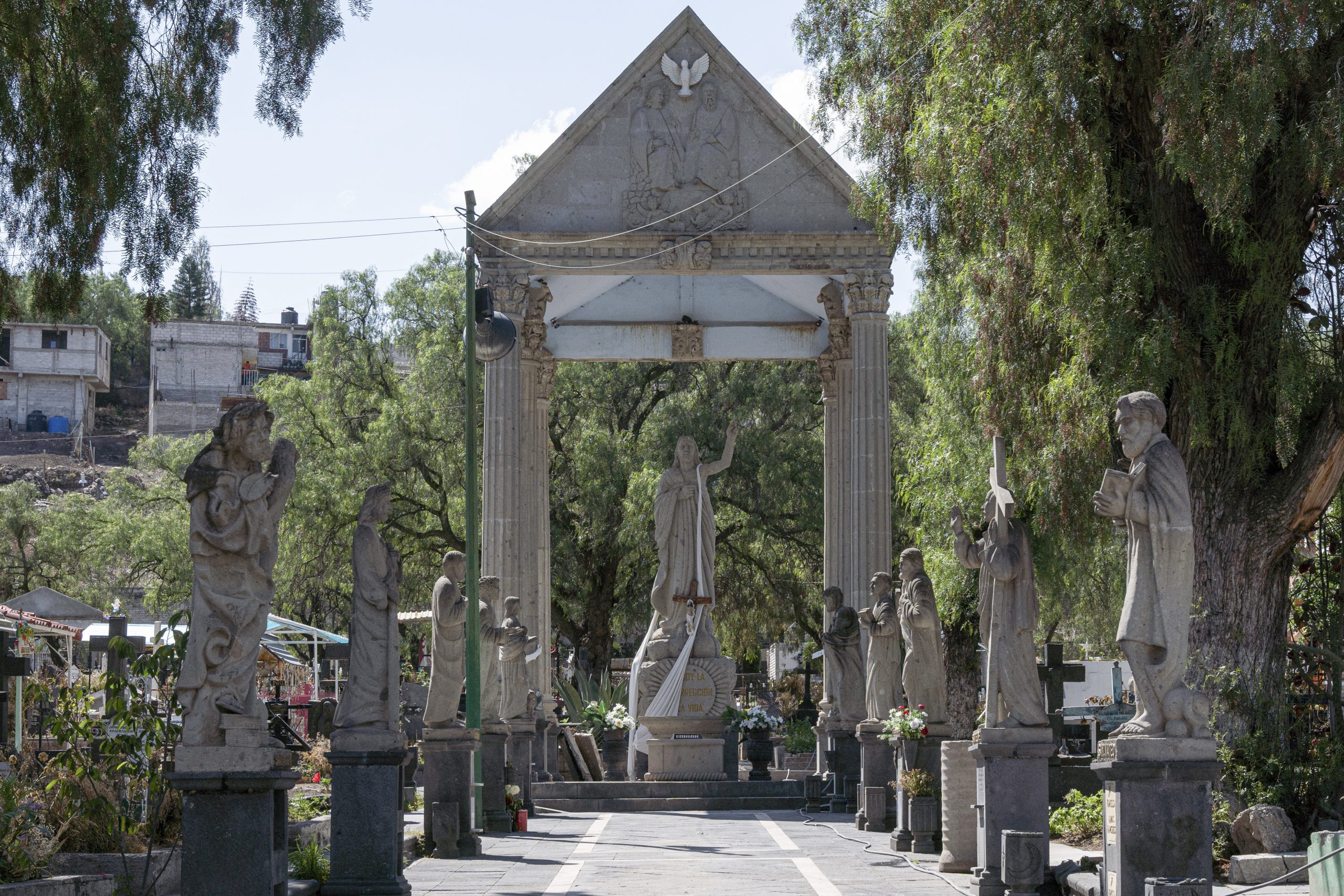 Cada domingo los artesanos dejan a un lado las actividades de sus talleres particulares para esculpir de manera gratuita diferentes obras en el pasillo del modesto cementerio donde los visitantes pueden contemplar hermosas figuras como un imponente Cristo de piedra de seis metros de alto o 12 apóstoles inspirados en esculturas europeas.