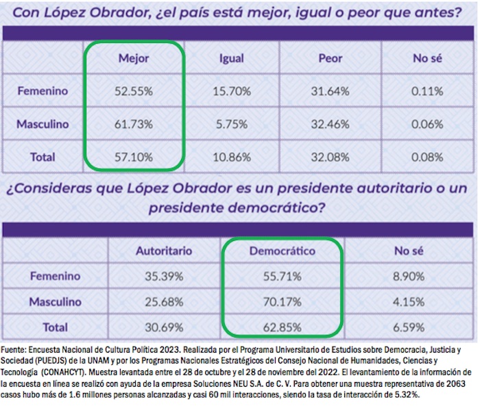 Los mismos resultados muestran que el 62.85 por ciento considera que López Obrador es un Presidente democrático, otro 30.69 por ciento lo califica como un mandatario autoritario. El 52.55 por ciento de las mujeres consideró que el país está mejor, mientras que el porcentaje de hombres que ve una mejoría ascendió a 61.73 por ciento.