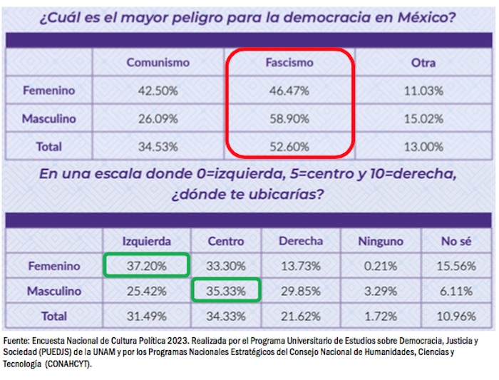 El 52.60 por ciento de los mexicanos consultados opinó que el mayor riesgo es que en nuestro país se impusiera el fascismo, mientras que el 34.53 por ciento valoró como peligroso al comunismo. Sobre estos datos de la Encuesta Nacional de Cultura Política 2023 se habló en "Puntos y Comas".