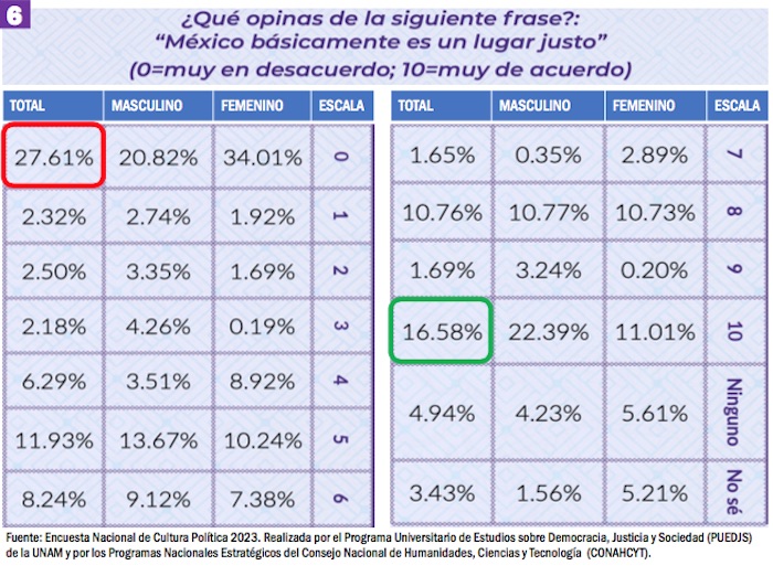 Otros datos importantes que arroja la Encuesta Nacional de Cultura Política 2023 es que sólo un 16.58 por ciento de la población considera que México es un país justo, en contraste con el 27.61 por ciento que tiene una visión pesimista y considera todo lo contrario. Apenas un 11.93 por ciento tiene una posición neutra y equilibrada, a mitad del pesimismo y el optimismo.