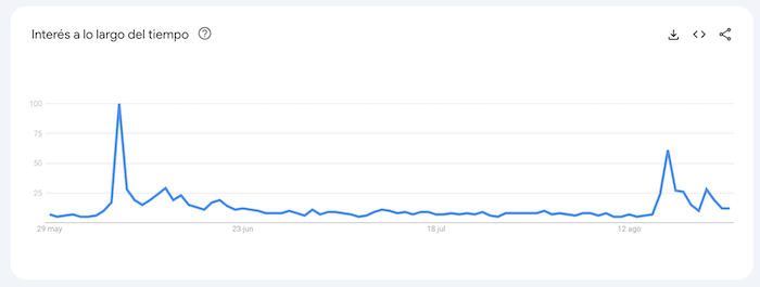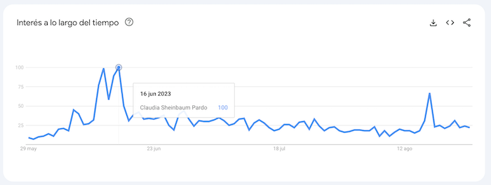 En 90 días (del 29 de mayo al 25 de agosto), Sheinbaum Pardo superó en sólo cuatro ocasiones el 50 en la escala de 100 que mide los intereses de búsqueda de usuarios y usuarias de Google. El 12 y 13 de junio alcanzó 77 y 99 de la medición respectivamente, luego de anunciar que dejaría su cargo como Jefa de Gobierno y presentó su renuncia.