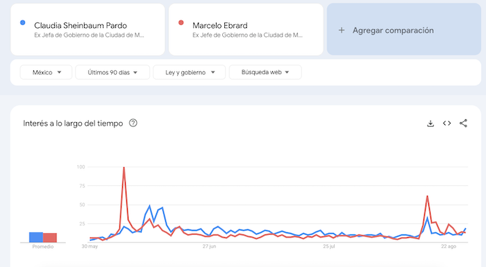 La información de la plataforma que mide el interés de usuarios sobre ciertos temas muestra que las búsquedas de los aspirantes se han mantenido casi en el mismo nivel de popularidad desde finales de mayo hasta agosto, pues en una escala del 0 al 100, donde el 100 representa el máximo alcance, la exjefa de Gobierno de la Ciudad de México mantuvo un promedio de 14, frente al de 13 de Ebrard Casaubón.