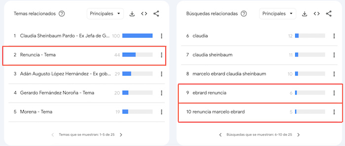 Algo similar ocurre en las búsquedas relacionadas, otro indicador analizado por Google Trends, donde las principales nueve y 10 nivel nacional son “ebrard renuncia” y renuncia marcelo ebrard”.