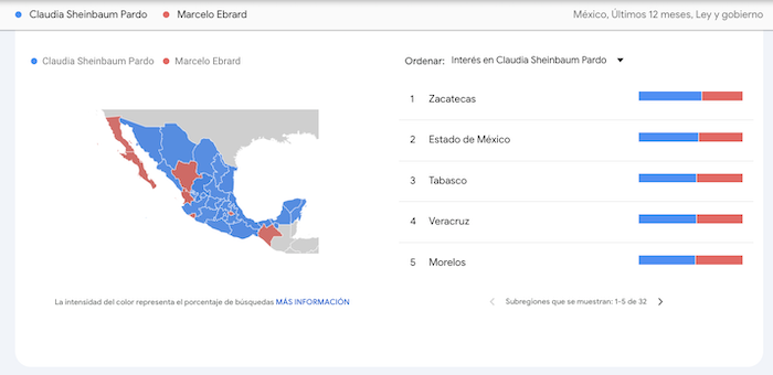 Donde sí se observan diferencias es en las entidades con más interés por el perfil de Sheimbaum Pardo y temas relacionados con ella, pues la funcionaria acumula mayor número de búsquedas en Google en 19 estados, mientras Marcelo Ebrard sólo en 10: Durango, Tlaxcala, Baja California Sur, Nayarit, Campeche, Guanajuato, Chiapas, Aguascalientes, Sinaloa, Jalisco.