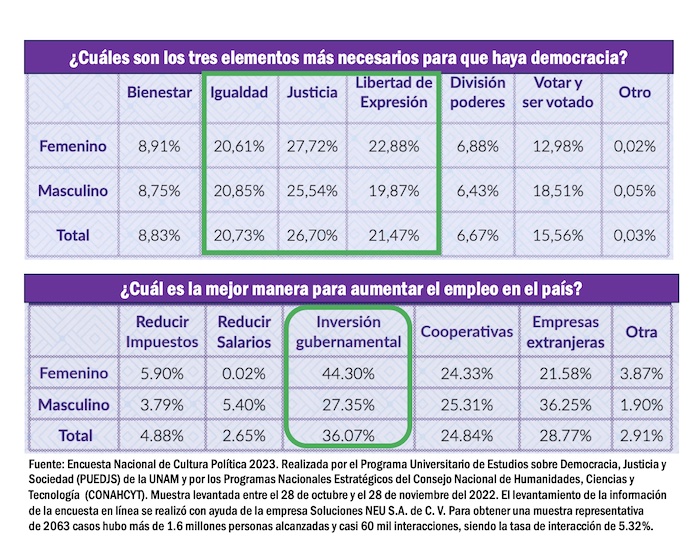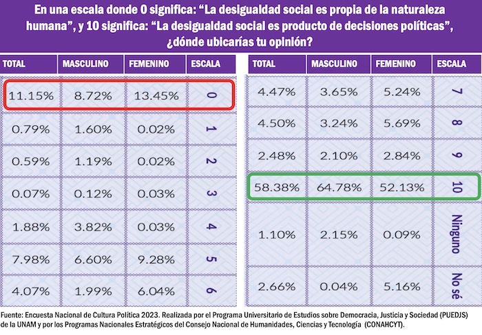 De acuerdo con los datos de la encuesta, más de la mitad de las personas encuestadas consideró que la desigualdad social es producto de decisiones políticas, en tanto que el 31.92 por ciento estimó que el gobierno debería aumentar los impuestos a los ricos para ayudar más a los pobres.