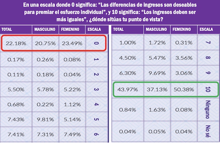 En tanto, un porcentaje mayoritario de la población, el 43.97 por ciento, estaría satisfecho si los ingresos para las personas en México fueran más igualitarios, aunque un 22.18 por ciento estima que las diferencias de ingresos son deseables para premiar el esfuerzo individual.