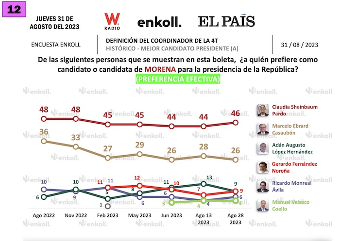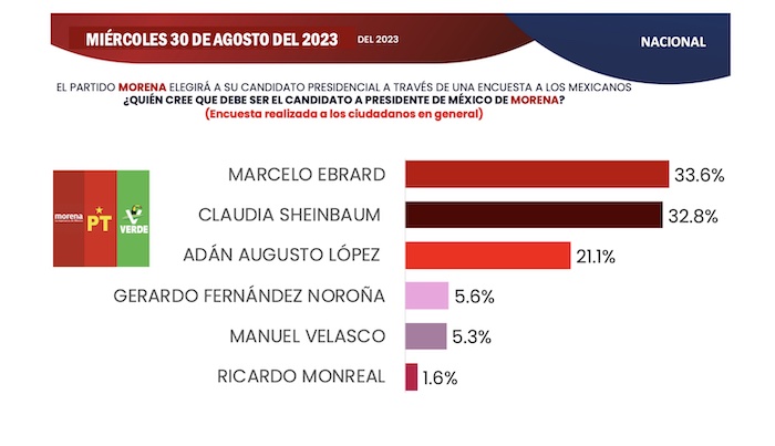 De las Heras Demotecnia y Enkoll son las consultoras que dan un mayor margen de ventaja a Claudia Sheinbaum, en tanto, Massive Caller presume que al cierre de agosto habría un empate técnico entre Sheinbaum y Ebrard.