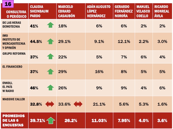 En cinco de estas seis encuestas, la ventaja de Sheinbaum Pardo es muy clara y sólo en una se presenta un empate técnico, con Marcelo Ebrard Casaubón, con menos de un punto porcentual de diferencia.