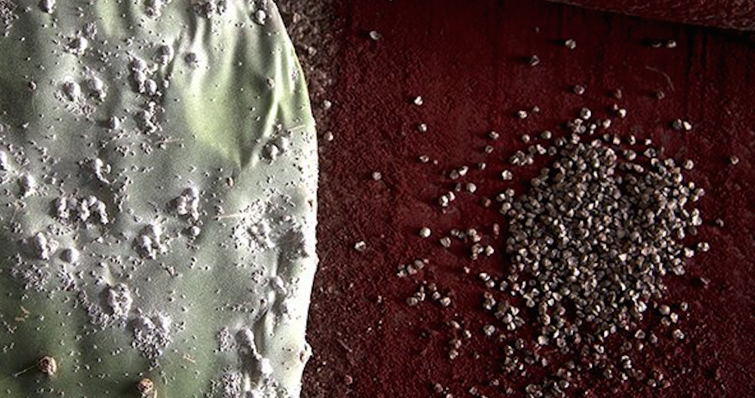 Obtener el tinte a la antigua usanza es un proceso lento, tedioso y minucioso. Procede de los cuerpos triturados de las pequeñas hembras del insecto, que contienen ácido carmínico y se alimentan de las yemas del nopal.