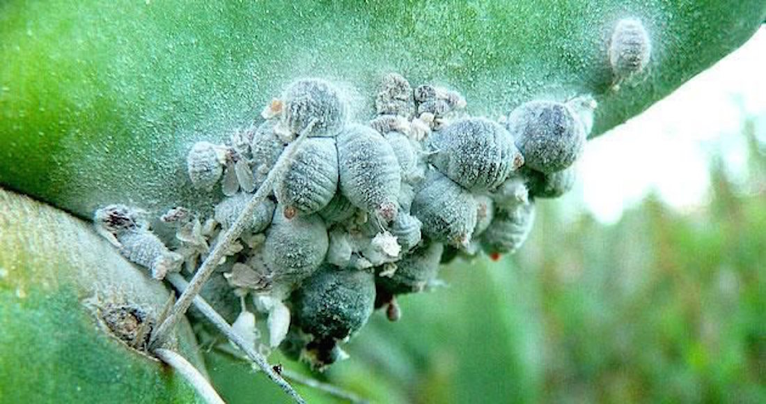 Cada insecto, conocido como Dactylopius coccus, debe criarse hasta su estado larvario y “plantarse” en una hoja de la planta previamente cortada, donde pasan meses alimentándose y madurando.