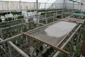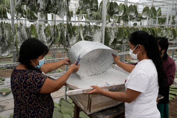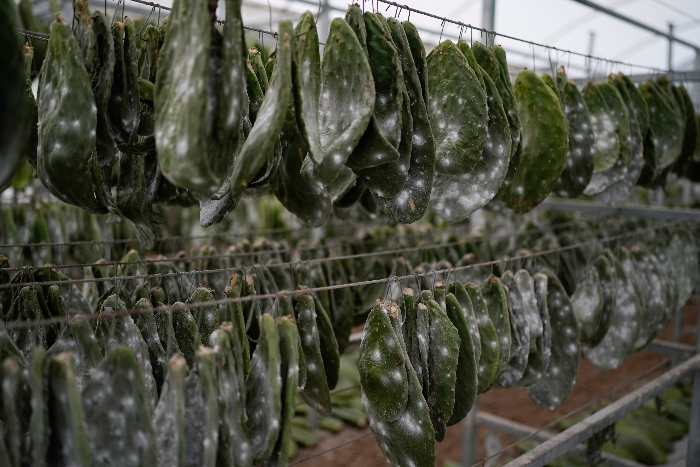 En su invernadero, filas con cientos de yemas de nopal cuelgan en bastidores suspendidos en el aire y cubiertas de un polvo blanco. Es la señal de que los insectos están trabajando debajo, nutriéndose de los jugos de la planta y protegiéndose con el polvo ceroso.