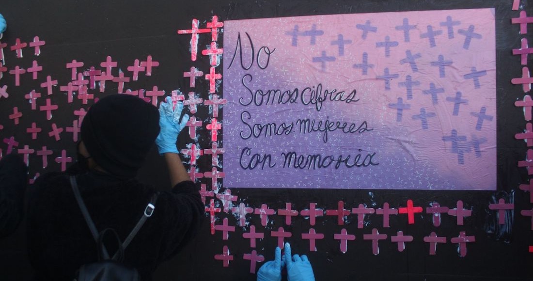 Los muros detrás de ellas, de un amarillo lánguido, están cubiertos de cruces negras sobre fondo rosa, el símbolo que ha persistido desde mediados de los noventas como memoria de una tragedia local que hoy abarca al continente entero. Las paredes son una ruina revestida además con carteles y pintas que lanzan una pregunta masiva, cargada de angustia: ¿Nuestras hijas dónde están?