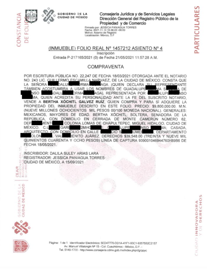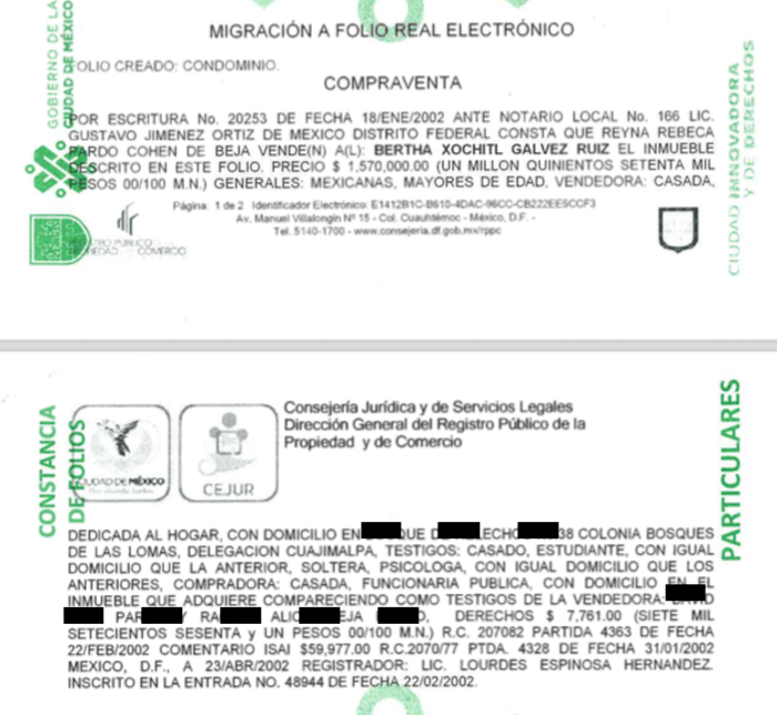 Las propiedades que están a nombre de Gálvez están disponibles en el Registro Público de la Propiedad. La casa de Monte Kamerún 62 tiene el folio 163738.