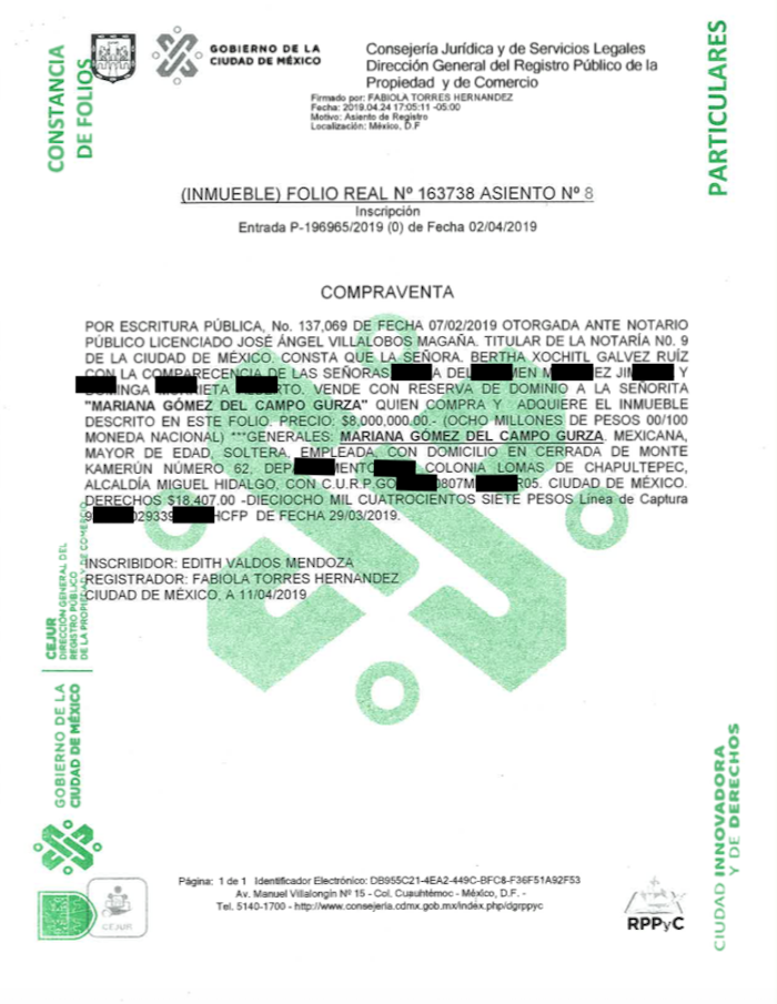 Seis meses después, el 2 de abril de 2019, se concretó la compra: Xóchitl vendió en 8 millones de pesos su propiedad de Monte Kamerún en Las Lomas a la panista Gómez del Campo.