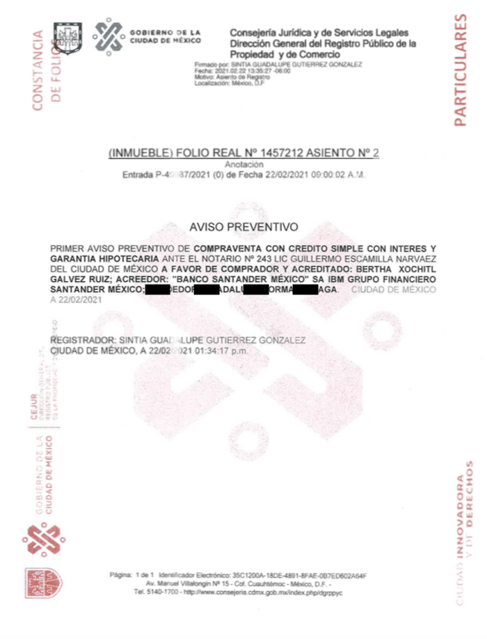 Sobre Sierra Santa Rosa 62 –con folio 1457212– el primer documento en el Registro es de junio de 2020 y le siguen los de 2021 en los que Gálvez compra.