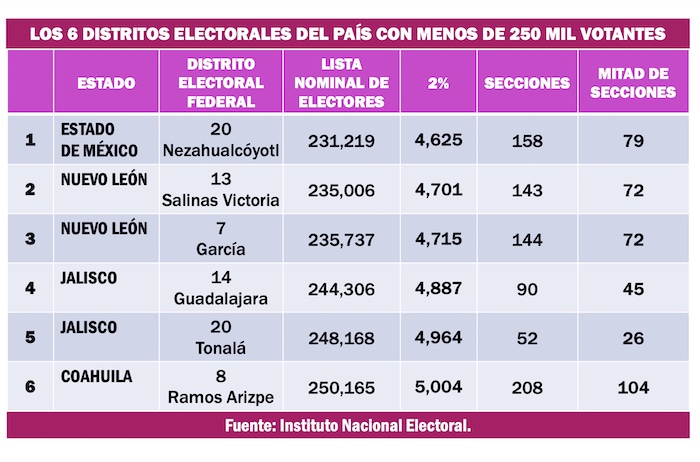 El distrito electoral federal con menos población de todo el país es el número 20 del Estado de México, perteneciente a Ciudad Nezahualcóyotl, cuya Lista Nominal de Electores cuenta con 231 mil 219 ciudadanos. Cinco distritos más tienen menos de 250 mil potenciales y votantes, dos en Nuevo León y dos en Jalisco, respectivamente, así como uno más de Coahuila, el número 8, con cabecera en Ramos Arizpe, que tiene apenas 250 mil 165 ciudadanos inscritos en su Lista Nominal de Electores.