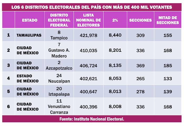 El distrito electoral federal más densamente poblado del país es el número 8, de Tamaulipas, que tiene por cabecera a la ciudad de Tampico, con una Lista Nominal de Electores de 421 mil 978 ciudadanos. Los otros distritos que superan los 400 mil potenciales votantes están ubicados, cuatro, en la Ciudad de México y el restante en el Estado de México.