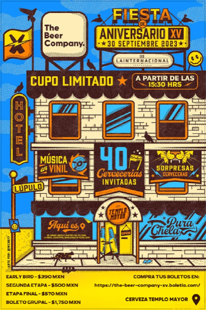 The Beer Company XV se realizará el 30 de septiembre a partir de las 3:30 pm en Cervecería Templo Mayor (Dr. Enrique González Martínez 155, Sta María la Ribera, Cuauhtémoc). El cupo es limitado y los boletos se pueden adquirir en https://the-beer-company-xv.boletia.com/, para aquellos que desean compartir la experiencia en grupo, podrán adquirir el Boleto Grupal (6 accesos) .