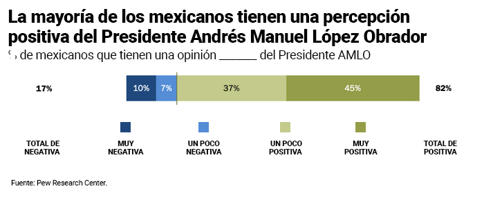 “El Presidente de México, Andrés Manuel López Obrador, también conocido como AMLO, es muy popular. Alrededor del 82 por ciento de los mexicanos tiene una opinión favorable de López Obrador, incluido el 45 por ciento que lo ve muy favorablemente”, señala el estudio.