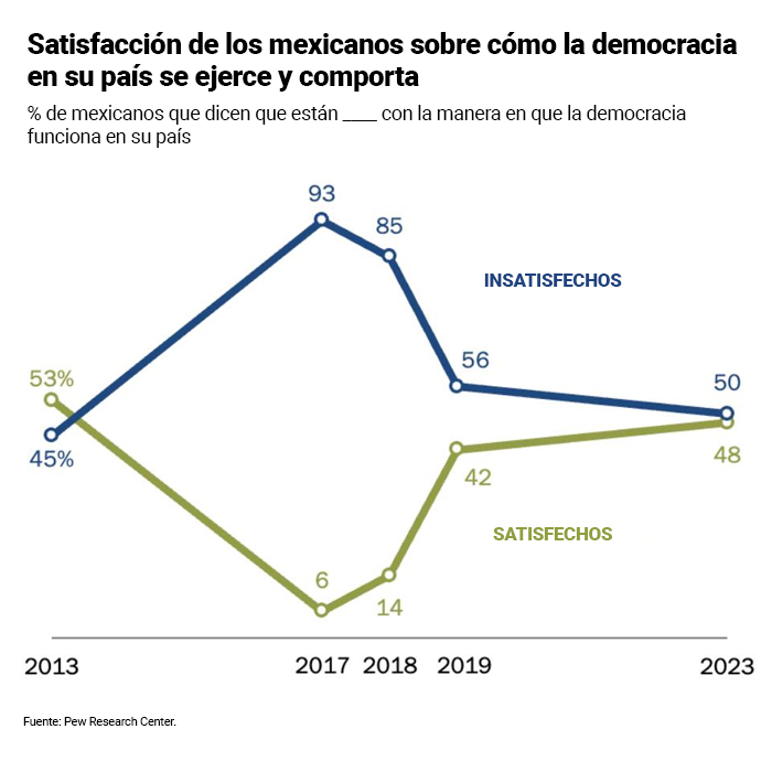 La proporción de personas que están satisfechas con la democracia de México ha aumentado en 6 puntos desde la última vez que se hizo la pregunta en 2019, cuando el 42 por ciento vio positivamente la democracia en el país. No obstante, este porcentaje era de sólo 6 por ciento en 2017, en el Gobierno de Enrique Peña Nieto.