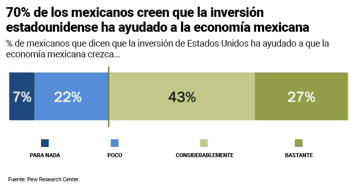 Además siete de cada diez mexicanos refieren que la economía mexicana se ha beneficiado en buena medida de la inversión estadounidense, mientras que el 29 por ciento dice que la economía no se ha beneficiado demasiado o en absoluto de la inversión estadounidense.