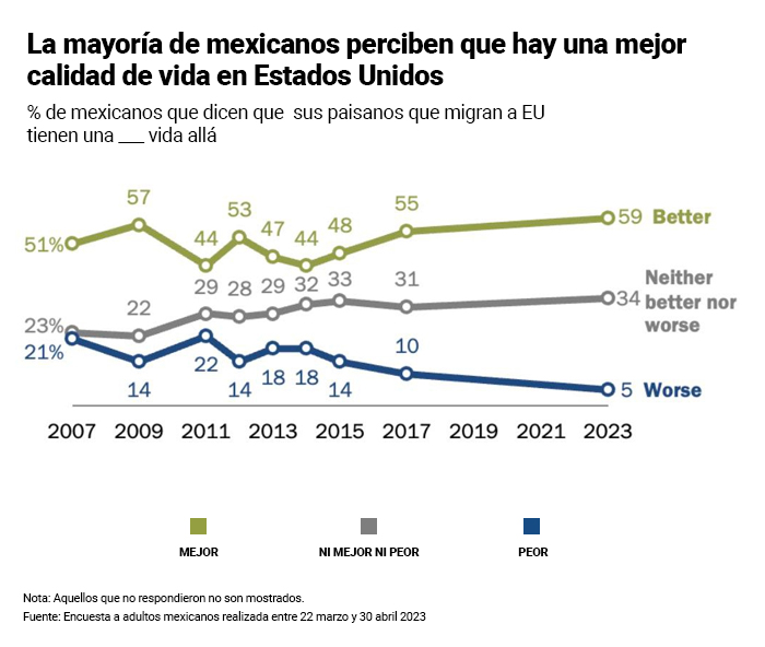 Los resultados muestran que seis de cada diez mexicanos (59 por ciento) dicen que las personas que se mudan a los EU tienen una vida mejor allí. Se trata de la proporción más alta desde que se hizo esta pregunta en 2007.