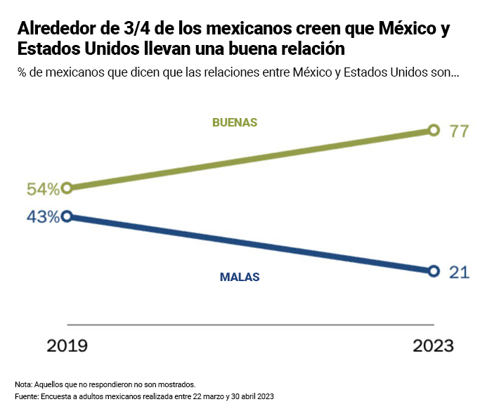 Otro resultado muestra que casi ocho de cada diez mexicanos (77 por ciento) ve que las relaciones entre Estados Unidos y México son buenas, una proporción que ha aumentado más de 20 puntos porcentuales desde la última vez que se hizo esta pregunta en 2019, durante la presidencia de Trump.