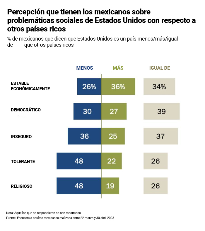 En cuanto a democracia, aproximadamente tres de cada diez mexicanos señala que Estados Unidos es más democrático que otros países similares. Con respecto a seguridad: el 36 por ciento considera a Estados Unidos como menos peligroso que otras naciones de primer mundo mientras que una cuarta parte de los mexicanos opina que es más peligroso.