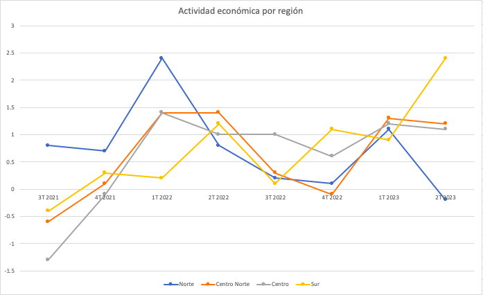 Sin embargo, a lo largo de estos meses los indicadores han mostrado un avance en actividad económica de los estados que componen dicha región. En el segundo trimestre de 2023, la actividad económica proyectada del sur del país repuntó por encima de las demás zonas, rompiendo así con el mito de un sur "flojo". En gran medida, analistas han atribuido este crecimiento con la construcción de megaproyectos como el Tren Maya, el Aeropuerto de Tulum, el Corredor Interoceánico, entre otros; pero preocupa que el desarrollo no se sostenga a largo plazo.