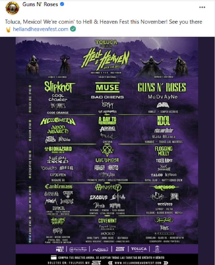 Ciudad de México, 17 de septiembre (SinEmbargo).- Hace unas semanas el Hell And Heaven reveló el cartel completo de este año y sorprendió con las bandas encargadas de los actos principales: Slipknot, Guns N’ Roses y Muse. Tras la venta de los boletos en abono de 3 días, llegó el cartel por día y la venta de boletos para quienes quieren ir un sólo día o bien, para quienes quieren ir 2, por ejemplo: viernes y sábado, sin duda una gran opción y aquí te compartimos detalles.
